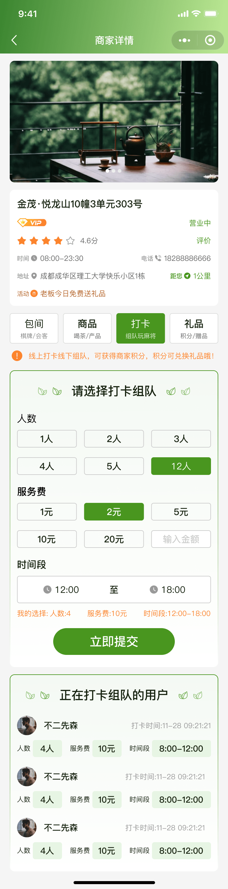 這款“約茶小程序”最具特色的功能之一是打卡組隊(duì)。用戶可以根據(jù)自己的需求選擇預(yù)約的人數(shù),并與其他預(yù)約用戶進(jìn)行隨機(jī)組合,形成一種類似于“組隊(duì)盲盒”的體驗(yàn)。這種設(shè)計(jì)既增加了用戶之間的互動(dòng)樂趣,也提高了社交的隨機(jī)性和新鮮感。
