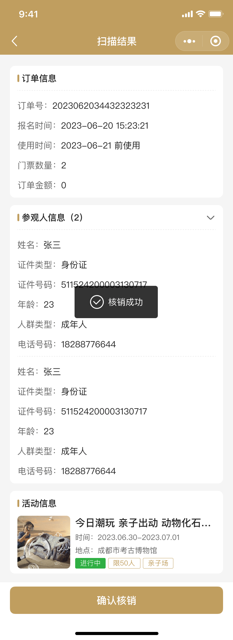 為了提高考古活動的組織和管理效率,小程序特別設計了開放日核銷、社教團隊核銷、社教個人核銷和講座核銷等功能。這些功能幫助工作人員快速確認參與者的預約信息,確?;顒拥捻樌M行。同時,核銷功能也為用戶提供了一種便捷的簽到方式,提升了整體的活動體驗。