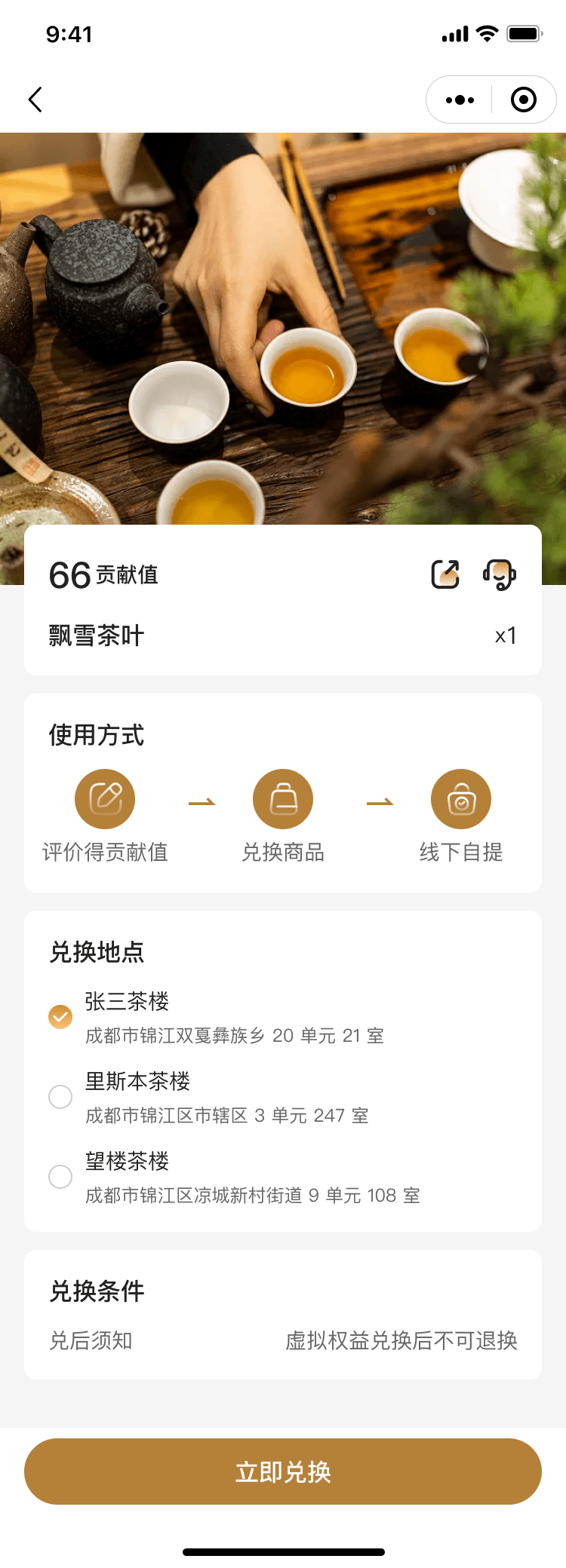 為了回饋廣大用戶,茶館預(yù)約小程序特設(shè)積分兌換功能。用戶在預(yù)約喝茶、參與活動等方面均可獲得積分,積分可兌換茶館優(yōu)惠券、茶品、周邊產(chǎn)品等。通過積分兌換,用戶在品茶的同時,還能享受到更多實(shí)惠和驚喜。