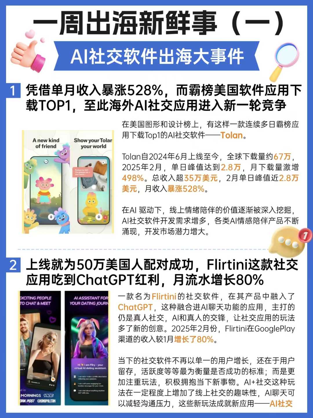 競品分析:研究當(dāng)?shù)仡^部社交產(chǎn)品(如歐美Tinder/Bumble、東南亞Tantan、中東Harmony)及AI社交創(chuàng)新應(yīng)用(如SwoonMe的AI虛擬形象、Replika的情感陪伴),找出差異化機(jī)會(如更精準(zhǔn)的AI匹配、垂直場景AI工具)。