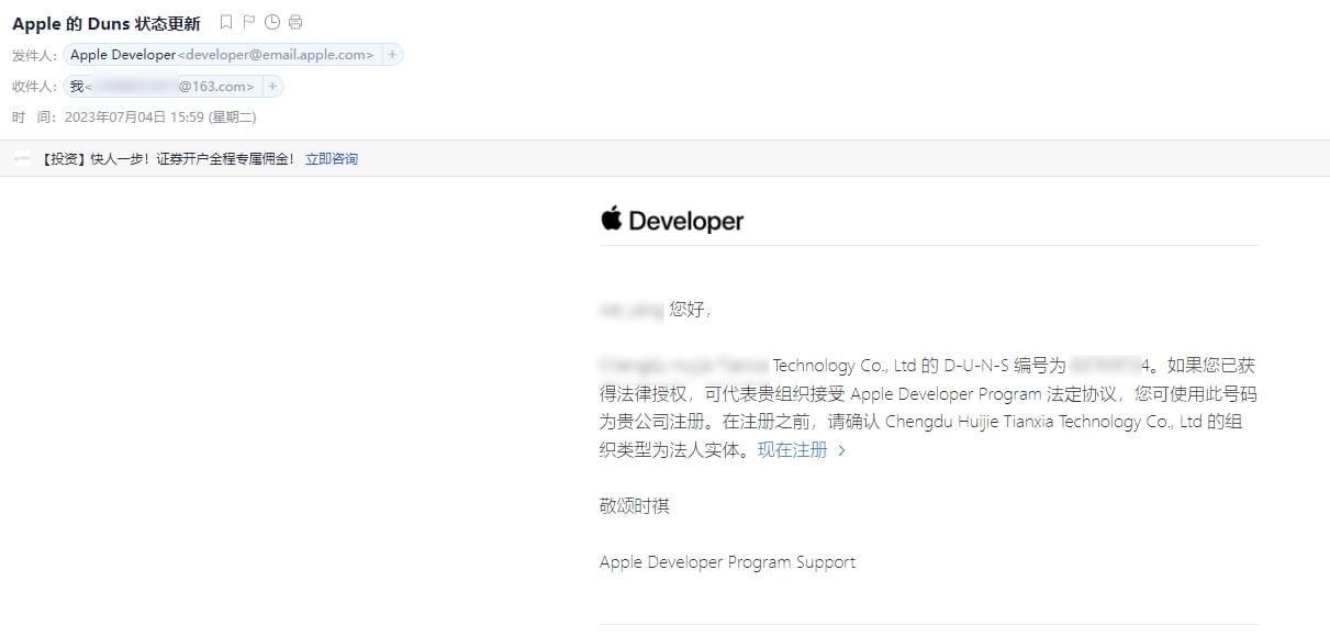APP有兩種身份的上架模式。一種是個人身份,另外一種是企業(yè)身份。如果是用企業(yè)身份申請上架,需要申請九位數(shù)的鄧白氏編碼。有時候蘋果開發(fā)者官網(wǎng)申請鄧白氏編碼的鏈接打不開,就需要聯(lián)系鄧白氏中國區(qū)的代理公司,嚴(yán)格按照對方的郵件要求進行申請。下面是小火科技公司給客戶申請鄧白氏編碼的截圖: