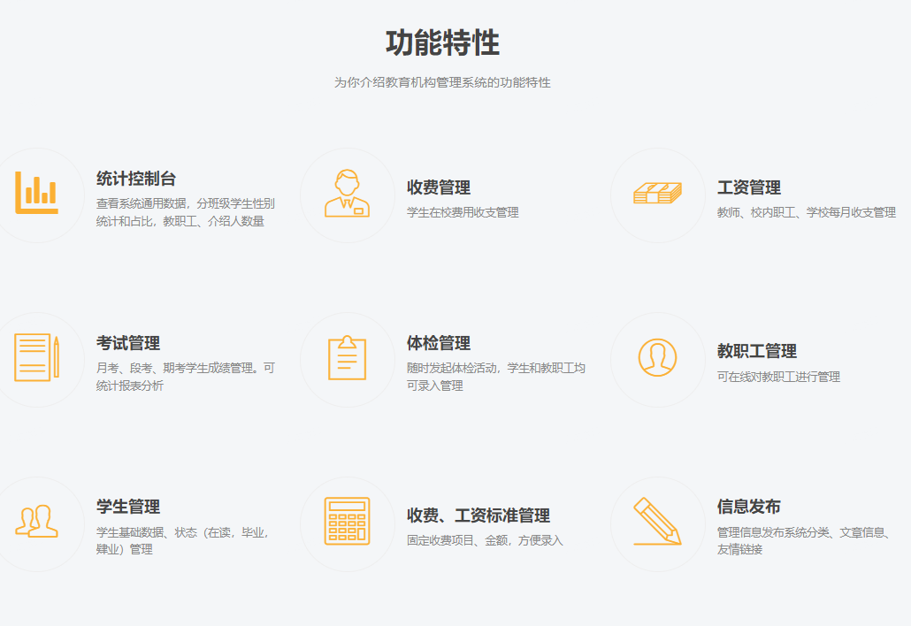 系統(tǒng)內(nèi)置信息發(fā)布功能,支持管理信息發(fā)布系統(tǒng)分類、文章信息、友情鏈接等功能。教育機(jī)構(gòu)可利用該功能,開展線上線下多元化的宣傳渠道,提升品牌知名度和影響力。