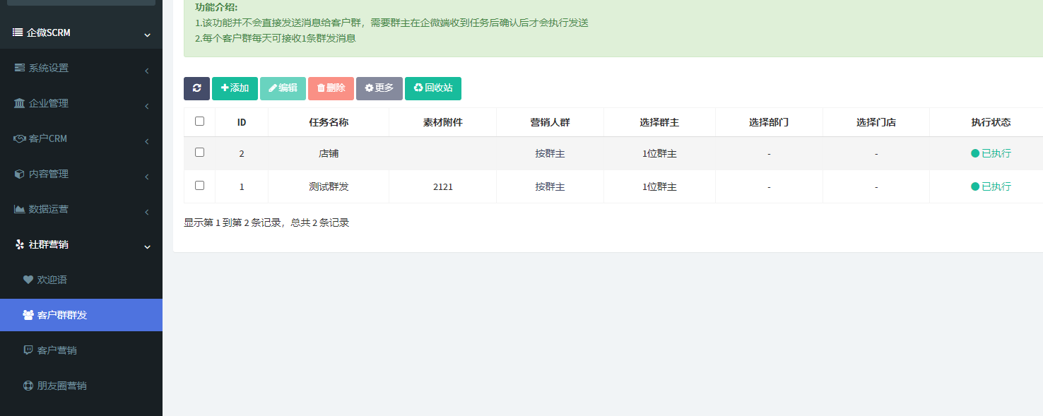 群發(fā)營銷功能模塊允許企業(yè)通過后臺設(shè)置群發(fā)任務(wù)及執(zhí)行員工,一鍵群發(fā)至客戶個微和群聊。這樣,企業(yè)可以快速地將營銷信息傳達給客戶,提高信息傳達效率。